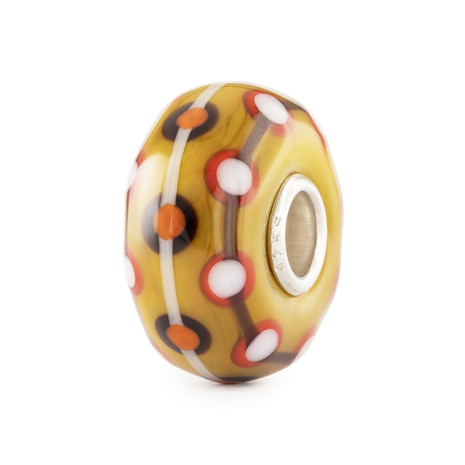 This glass bead has a classic shape and smooth surface. This glass bead has a classic shape and smooth surface. It is crafted in brown, orange, red and white colours of glass en has a fun design with dots and stripes. A sterling silver core adds a refined finish, making it as enduring as it is radiant.