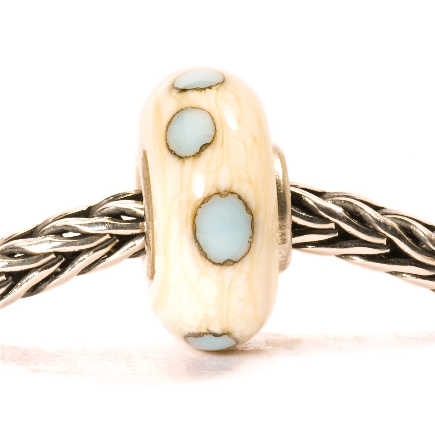 An ivory bead with floating, light-blue specks. It must have been the horn of a magical unicorn which inspired this unique colour combination.
