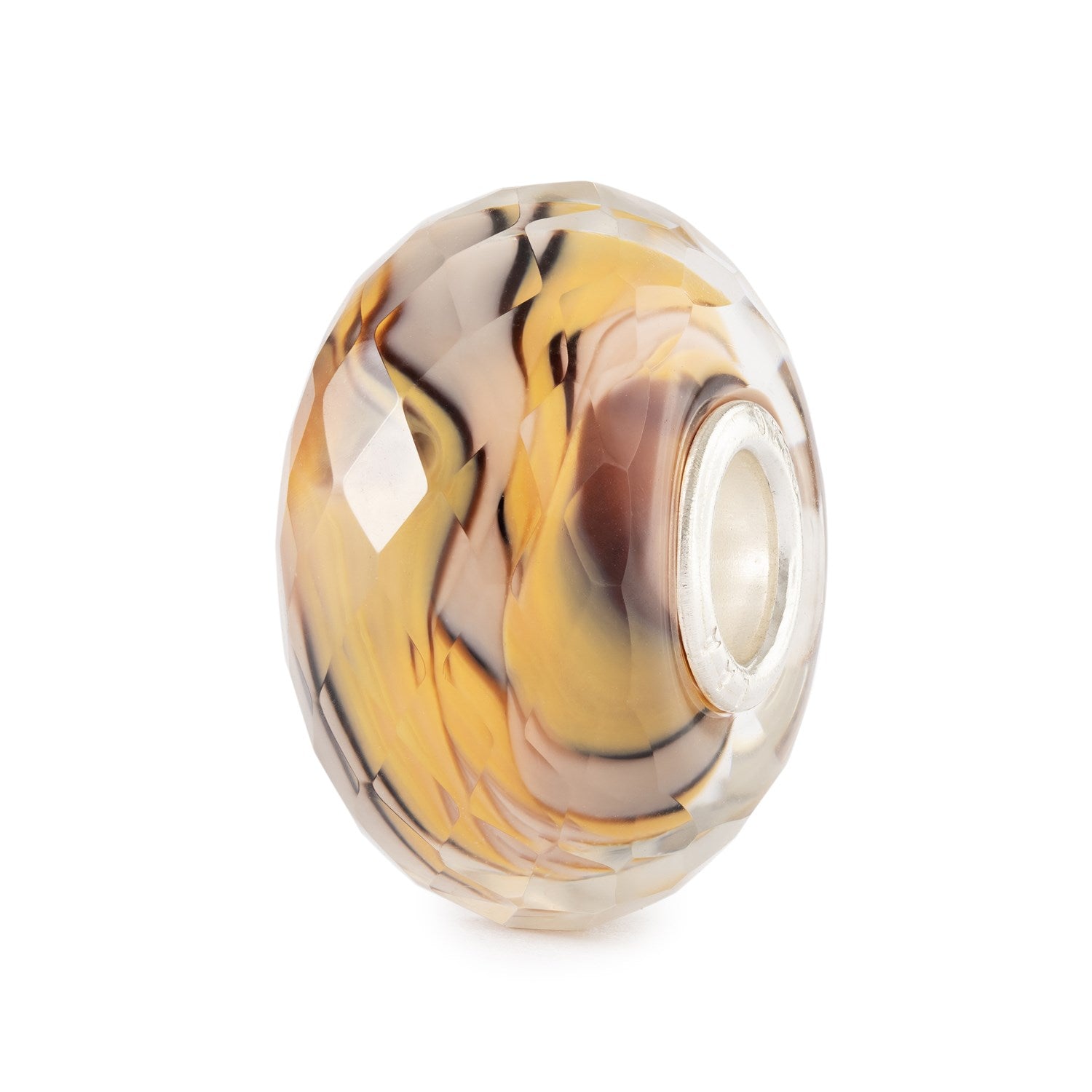 This faceted glass bead catches the light beautifully, its warm tones of orange, beige, and purple-brown glowing with quiet elegance. A sterling silver core adds a refined finish, making it as enduring as it is radiant.