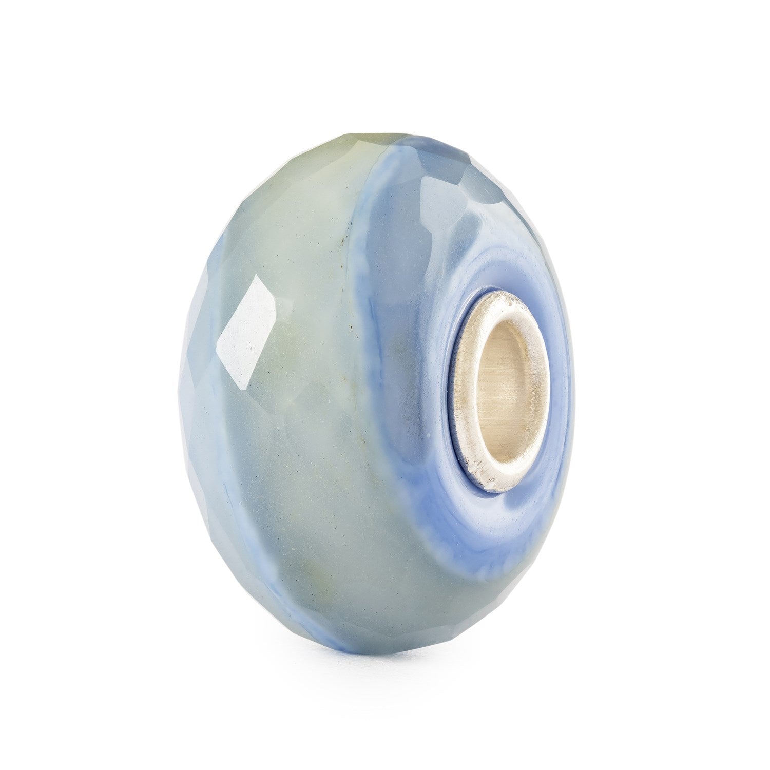 This glass bead is a Waterstone bead. Waterstone beads are inspired by the grace of water and the enduring strength of stones. Their colors are reminiscent of springtime by the lakeshore, and their faceted surface beautifully reflects light, evoking the shimmering surface of a lake.