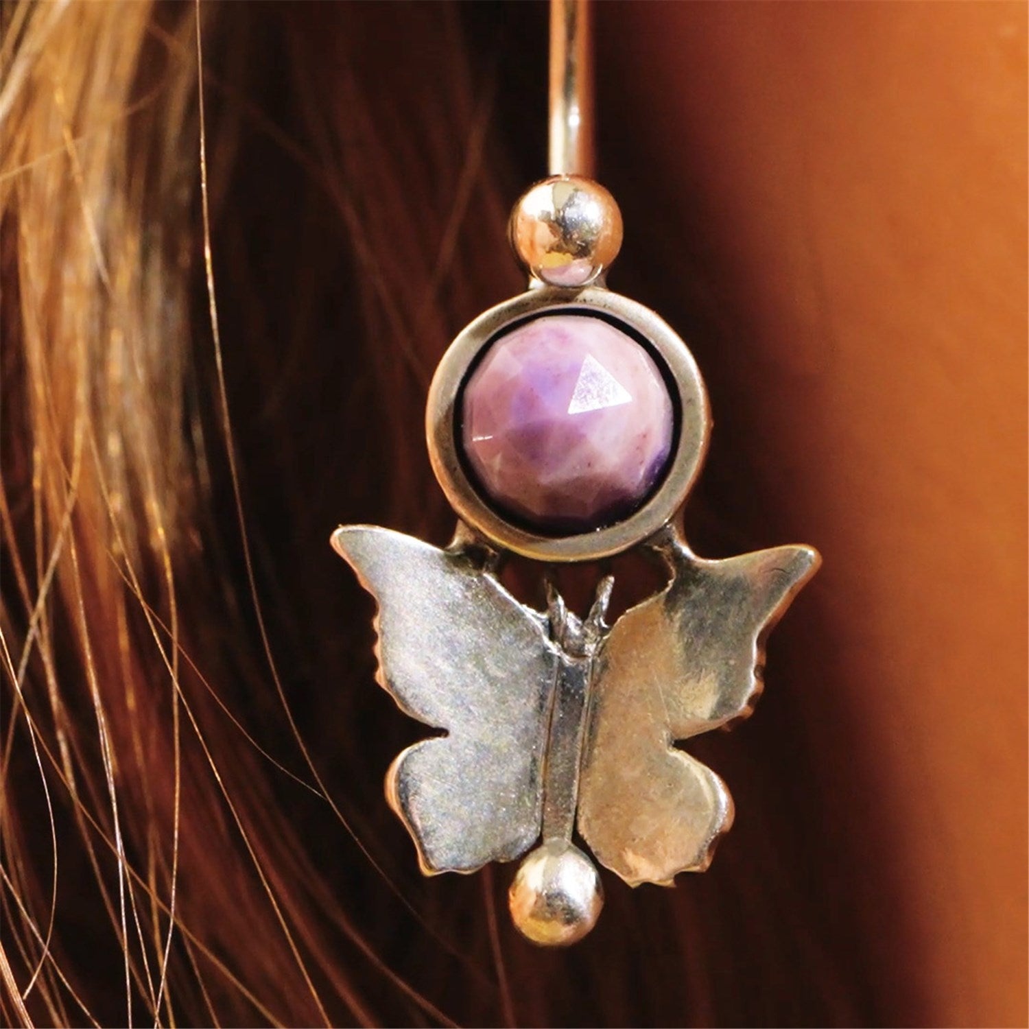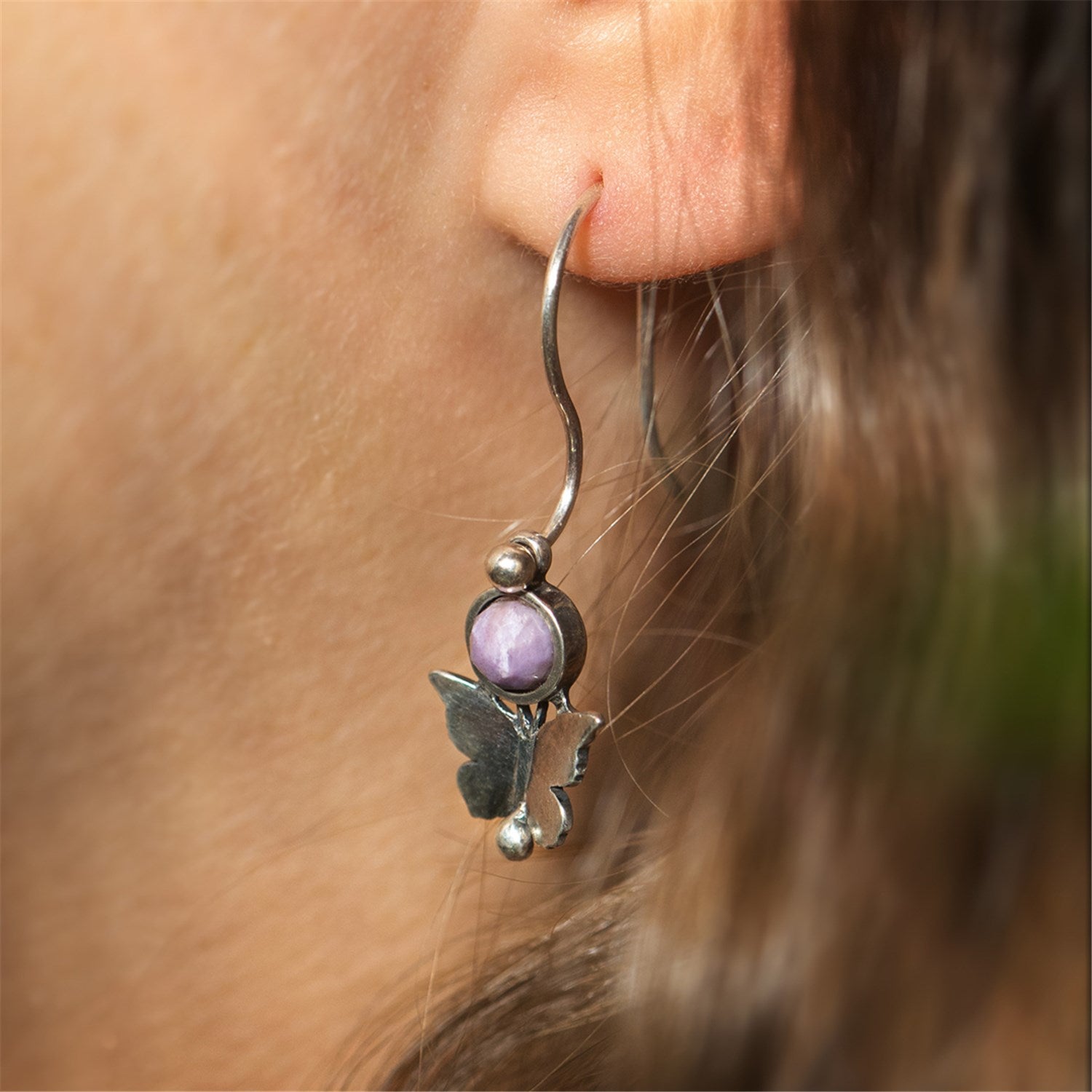Detailed butterflies surround soft Purple Jade, adding a touch of gentle movement and warmth. The combination of silver and gemstone reflects both strength and sensitivity, a graceful reminder of balance in love.