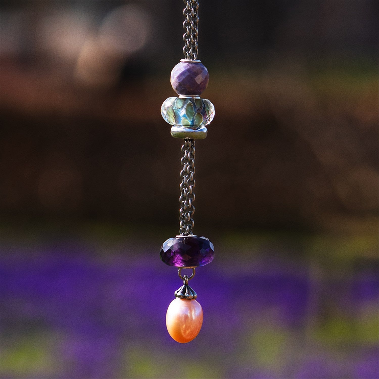Soft tones of lavender, mint and pale blue blend beneath the faceted surface. Each bead is handmade in glass, creating a misty depth that shifts gently with the light.