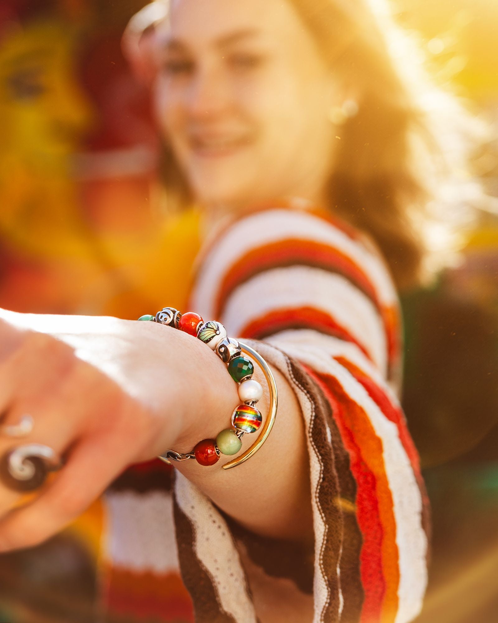 In summer, colours deepen and the light glows with golden warmth. Wear the feeling of endless summer days on your wrist by styling a gold-plated bangle with your favourite beads and spacers.